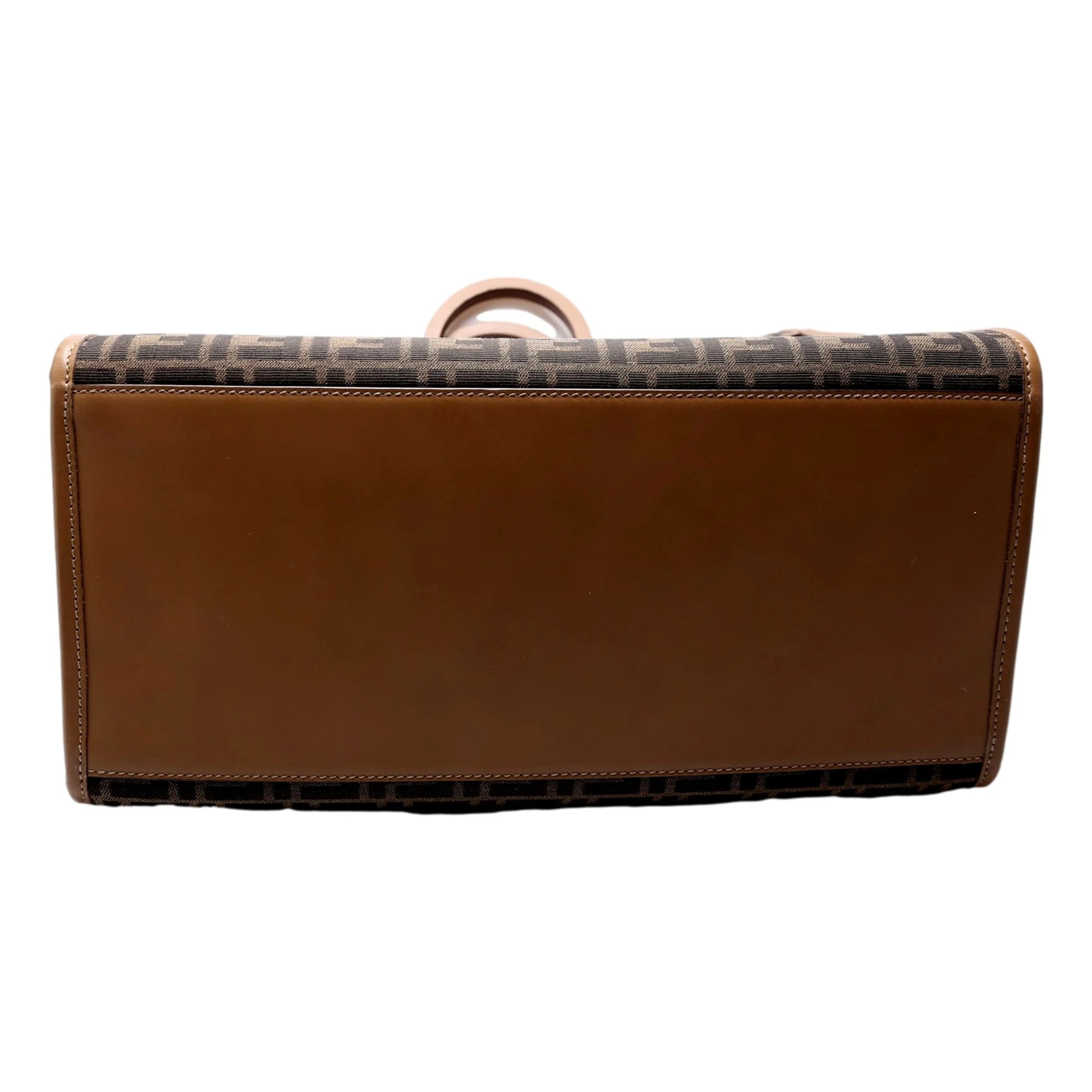 Make a bold impression with this timeless “Sunshine” large tote bag created by Fendi’s signature brown Zucca jacquard canvas and finished with smooth brown calf leather accents, a striking blend of iconic design and everyday function. Zucca jacquard canvas is a specific fabric used by the luxury brand Fendi, featuring its iconic, repeating FF logo pattern. It is a canvas material woven with the double "F" (Zucca) print, often combined with calf leather trim and hardware to create handbags, wallets and other accessories. The term "jacquard" refers to the weaving technique used to create the intricate, raised pattern directly into the fabric.