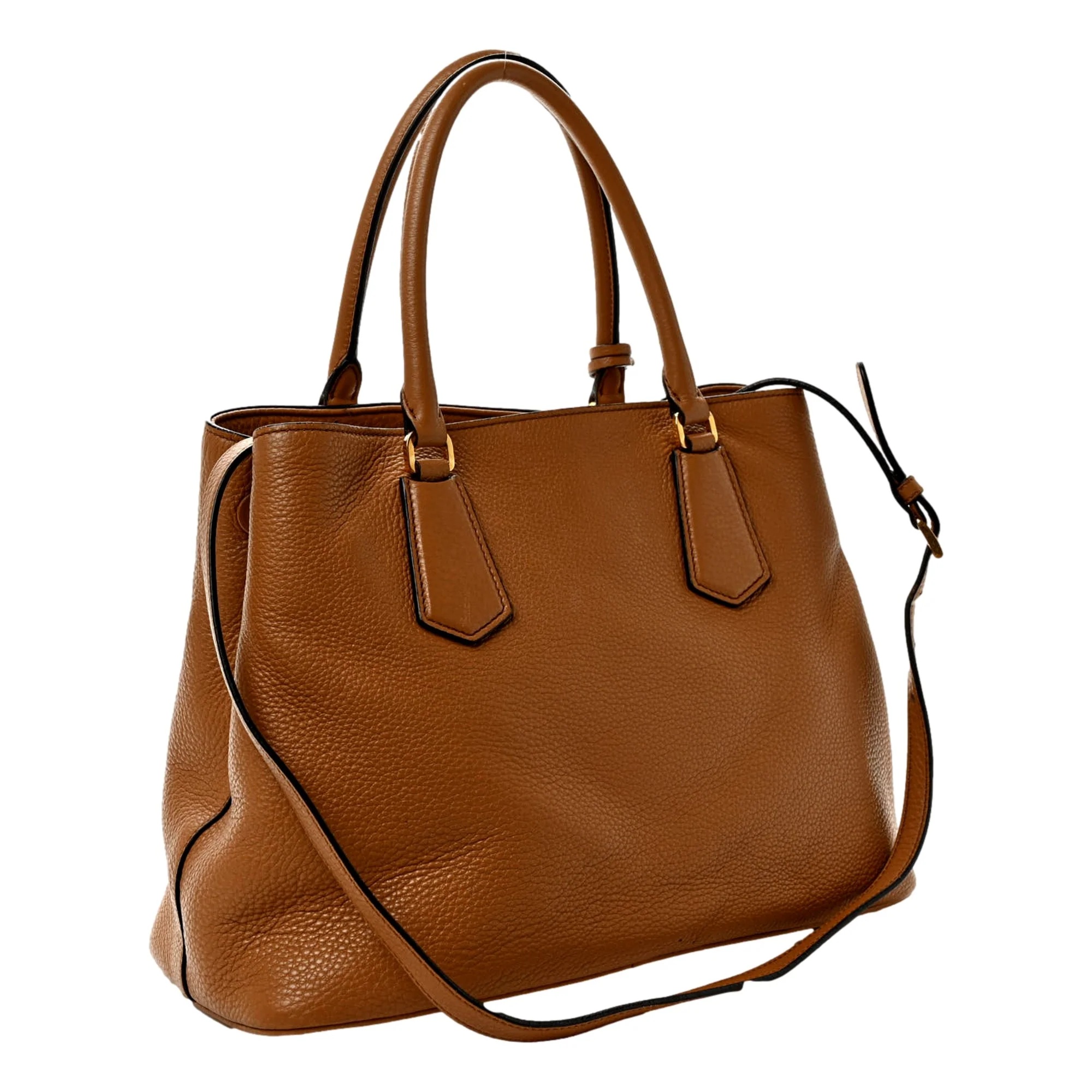 New, modern and trendsetting, this “Galleria” handbag created by Prada’s in caramel brown vitello Phenix calf leather offers a polished take on everyday elegance. Vitello Phenix leather is a calf leather with a lined and textured grain.