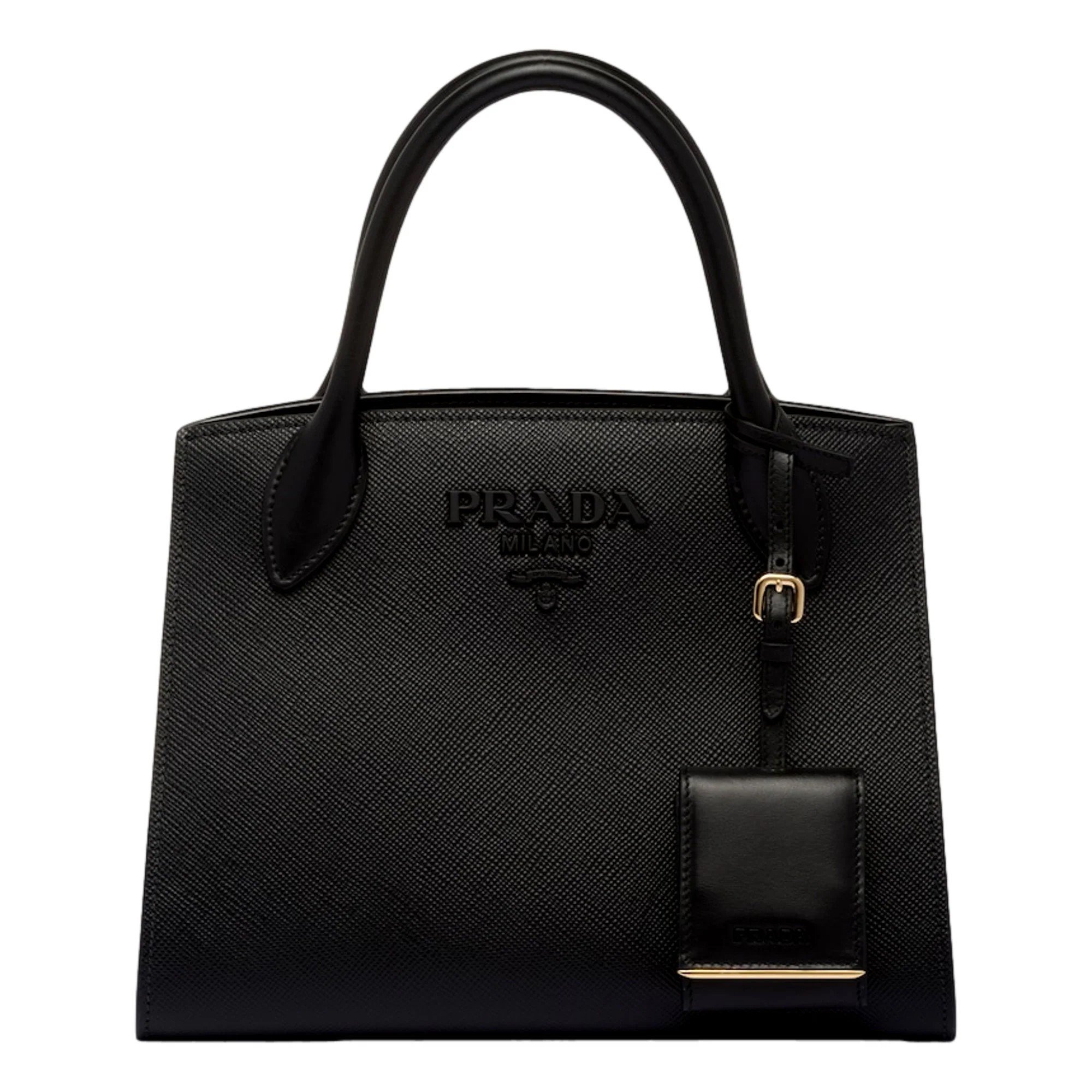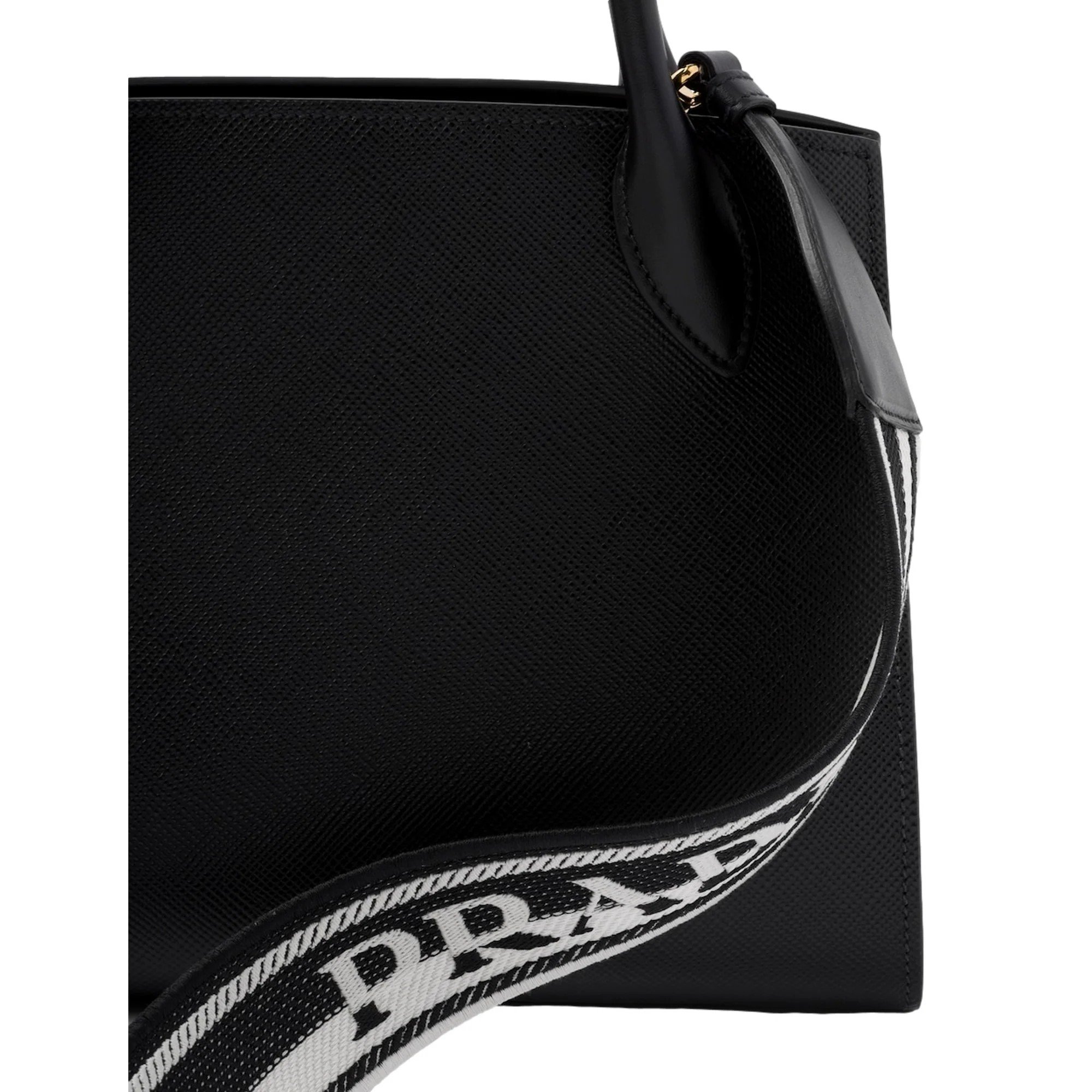 Features of this luxurious handbag/tote bag reveal one compartment offering ample space for your cellphone, passport, keys or other essentials, a leather/logo-print nylon lining and an inside zipper and slip pocket. In addition, there is a snap-button closure on both sides for added security to keep your belongings safe while traveling and two top calf leather handles to make it easier to grab while on the go. A durable removable woven logo-print web shoulder/crossbody strap allows you the versatility to wear this bag on your shoulder as a shoulder bag or across your body as a crossbody bag, providing additional carrying options. A front varnished black-tone iconic “Prada Milano” and an inside gold-tone “Prada” logo serves as a symbol of unparalleled style and luxury, a removable calf leather coin purse with mirror and silver-tone metal hardware detail to finish the stunning appearance of is spectacular handbag/tote bag. Each Prada monochrome handbag/tote bag w/ a web strap includes a card-sized “authenticity card” so you know you are getting a genuine Prada original and a “dust bag” to keep it in new condition for many years to come. It is made in Italy from premium quality classic black Safiano calf leather.