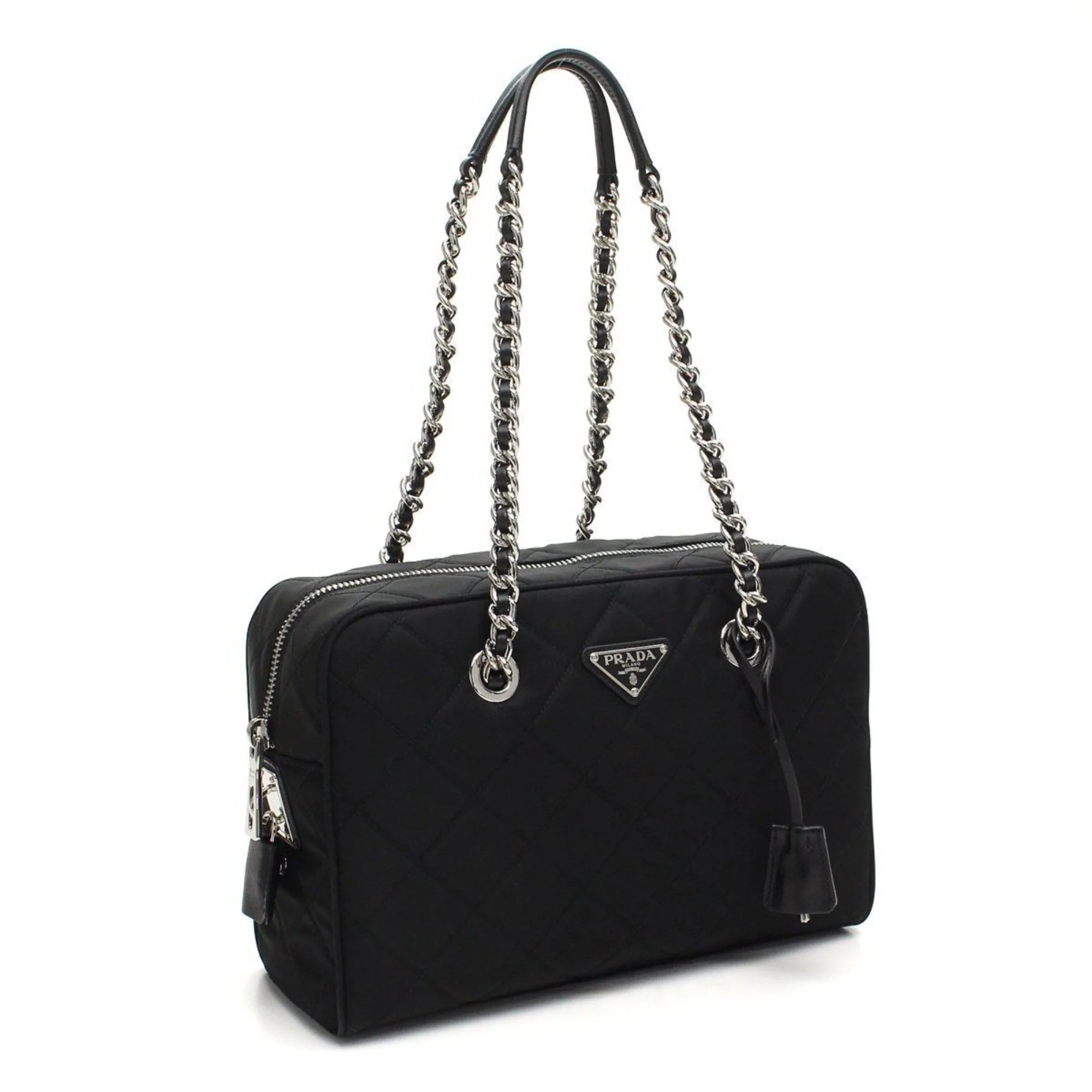 This handbag boasts a single, trusty compartment awesome for stashing your wallet, cellphone, passport, keys or other pint-sized treasures you can’t bear to part with. Lined with classy Prada jacquard and armed with an inside zipper plus two slip pockets, it’s basically a fortress for your stuff. The top wrap-around zippers, complete with optional padlock and keys, keeps nosy hands out, while the removable calf leather clochette and keys add a dash of “I’m stylish, but also prepared for a heist” flair. The notorious clochette is a simple yet vital part of many luxury handbags. Translated, a clochette is French for “bell”. It is a leather tab fastened to the handle with a matching strap that holds a key. These useful accents allow you accessorize in style. Armed with sturdy little feet acting like pint-sized bouncers, fending off dirt and scratches, and sporting two glamorous chain shoulder straps crowned with plush calf leather shoulder pads that treat your shoulders like royalty, this bag will sashay by your side for years ... stealing glances and spoiling you in style. The front triangle silver-tone “PRADA Milano” logo glitters, striking a pose against the smooth Nero black nylon, while the silver-tone metal hardware winks like it knows it’s the best-dressed accessory in the room, finishing this heartbreaker with flair. This handbag adds a splash of effortless luxury to any outfit, blending sophistication, style and just enough glamour to make any outfit feel fancy. With its correct medium shape and chameleon-like ability to glide from day to evening, it’s the ultimate sidekick for pulling off polished elegance without breaking a sweat.